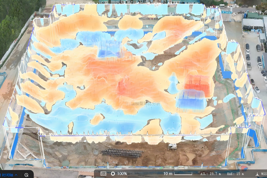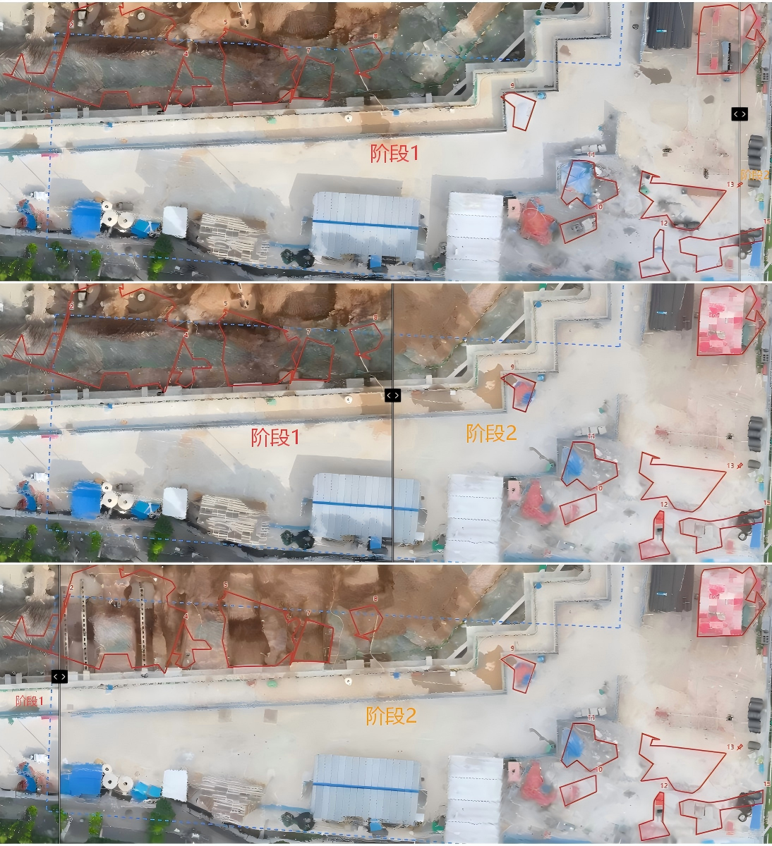 通過空間模型與時間軸結合,系統對多時間點二維、三維及斷面模型數據自動比對,直觀呈現土方開挖變化與工程進度,為進度計劃制定和優化提供支撐。同時,AI圖像比對技術可自動識別不同時間點模型間的差異區域,實現施工區域動態變化精準監控。