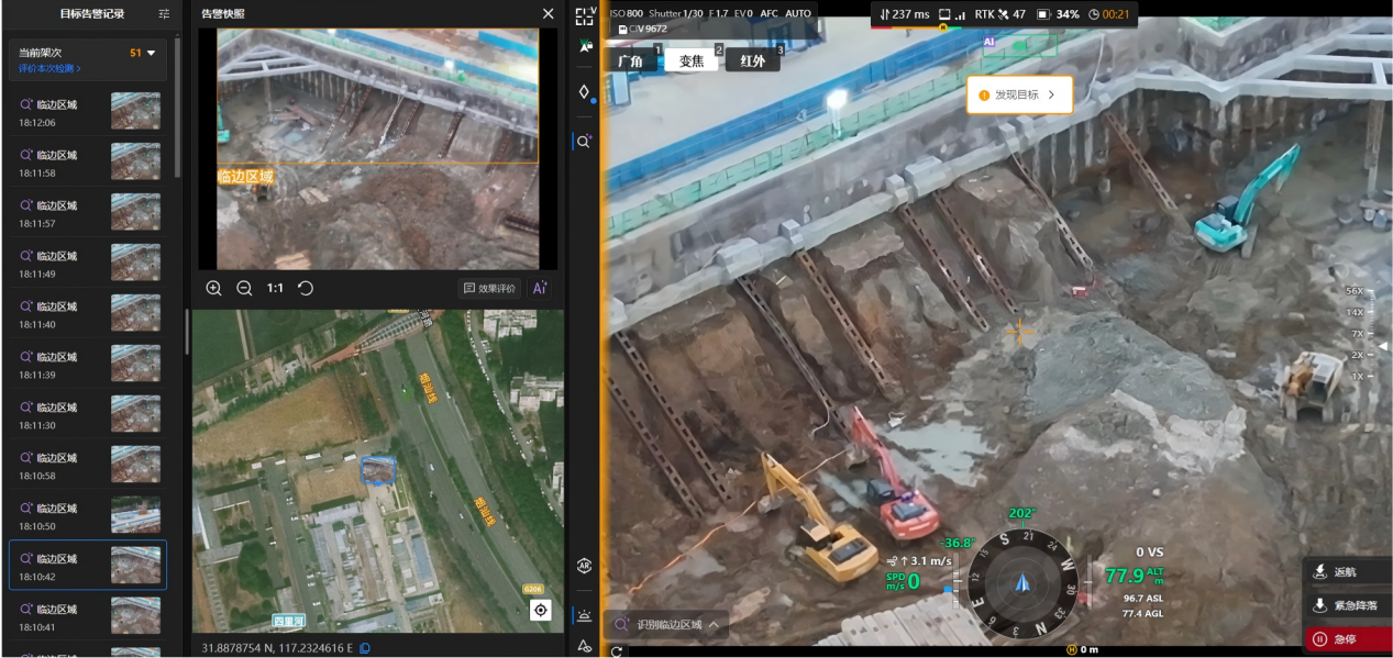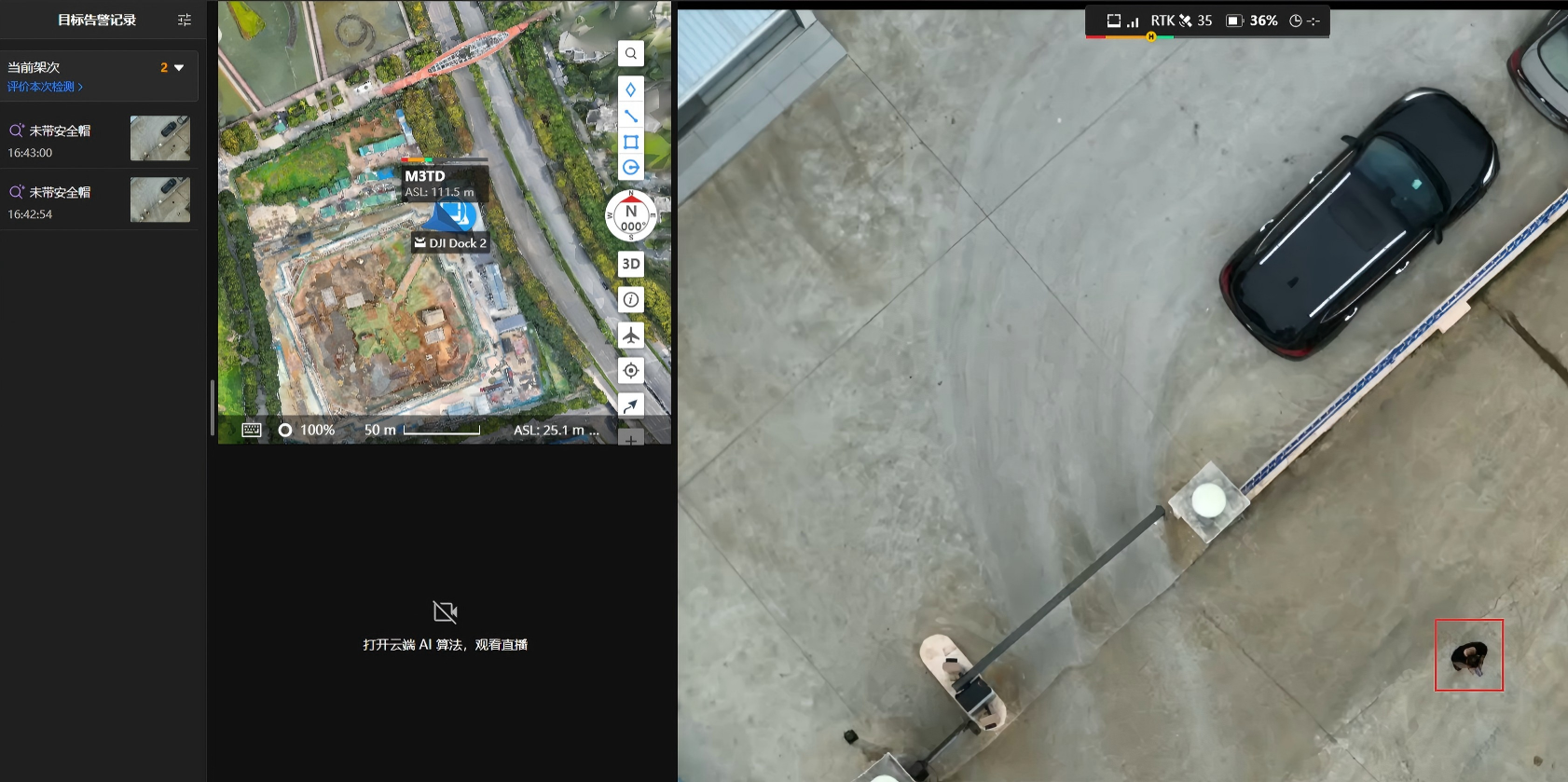 該項目部署具備定時自主飛行與實時傳輸能力的無人機機場系統,結合AI算法引擎實現施工現場精度還原與目標智能感知。在安全管理方面,無人機按預設航線自動巡檢或遠程操控,實時回傳畫面,AI大模型視覺算法可自動識別未帶安全帽、臨邊區域等隱患,觸發告警并記錄目標信息,助力管理人員快速排查處置,擴大巡查范圍、縮短隱患處置時間,提升安全管理效率。